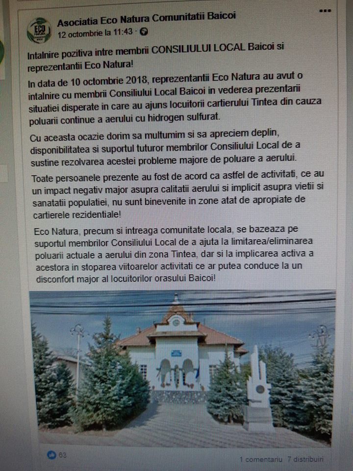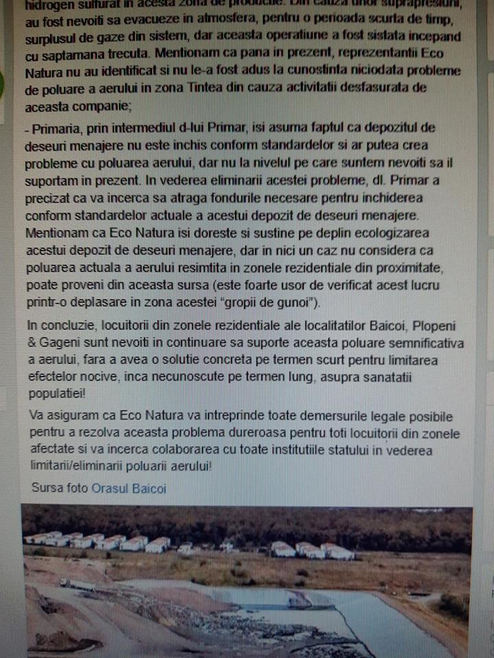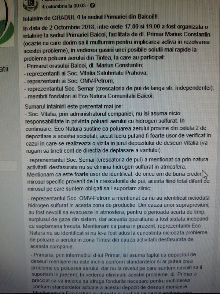 În ședința Consiliului Local din 10.10.2018, s-a vehiculat intens „ecologizarea aerului” Orașului Băicoi. Cu toate acestea, S.C. AGRISOL INT RO. S.R.L. urmează să obțină autorizația de mediu pentru „hala de depozitare și tratament a dejecțiilor avicole” chiar în Orașul Băicoi. Așadar, despre ce „purificare a aerului și a mediului” vorbesc „ecologiștii” și Primăria Băicoiului? Nu există așa ceva, din păcate.