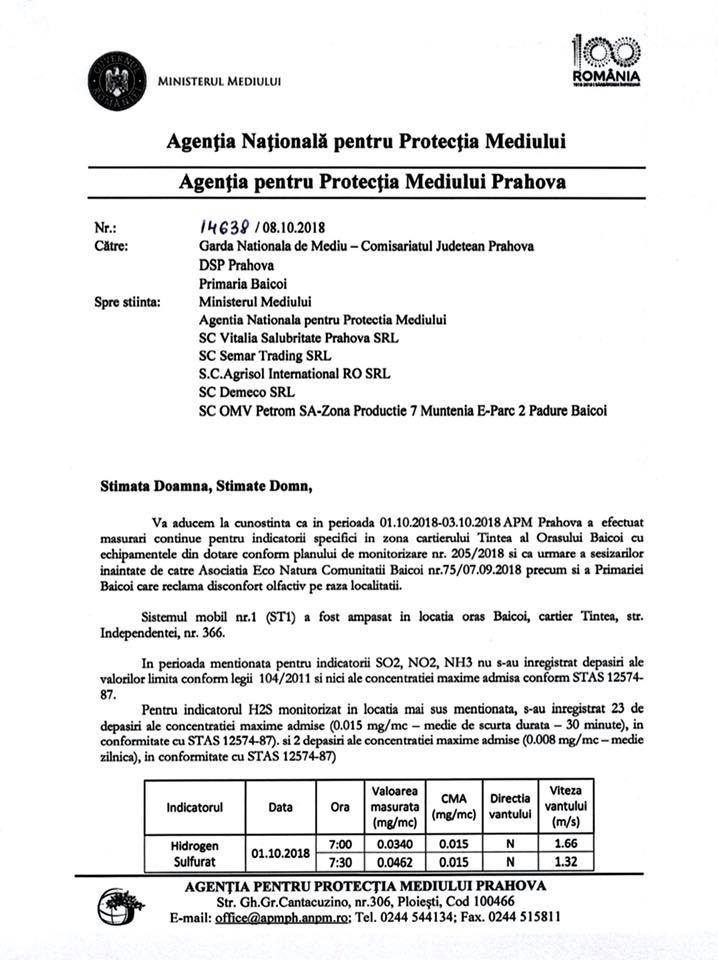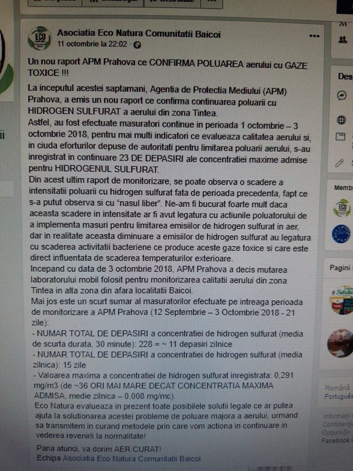 Eliberarea în cantități intermitente de hidrogen sulfurat în atmosfera orașului Băicoi este o practică mai veche a giganților petrolieri (OMV Petrom) recunoscută dealtfel și de aceștia în ședința din 02.10.2018 ținută la sediul Primăriei Băicoi: reprezentantul Soc. OMV-Petrom a mentionat ca nu au identificat niciodata hidrogen sulfurat in acesta zona de productie. Din cauza unor suprapresiuni, au fost nevoiti sa evacueze in atmosfera, pentru o perioada scurta de timp, surplusul de gaze din sistem, dar aceasta operatiune a fost sistata incepand cu saptamana trecuta. ”. Această eliberare intermitentă a hidrogenului sulfurat a fost stabilită și prin măsurătorile efectuate de Asociația pentru Protecția Mediului Prahova numai că… „nu se știe vinovatul”.