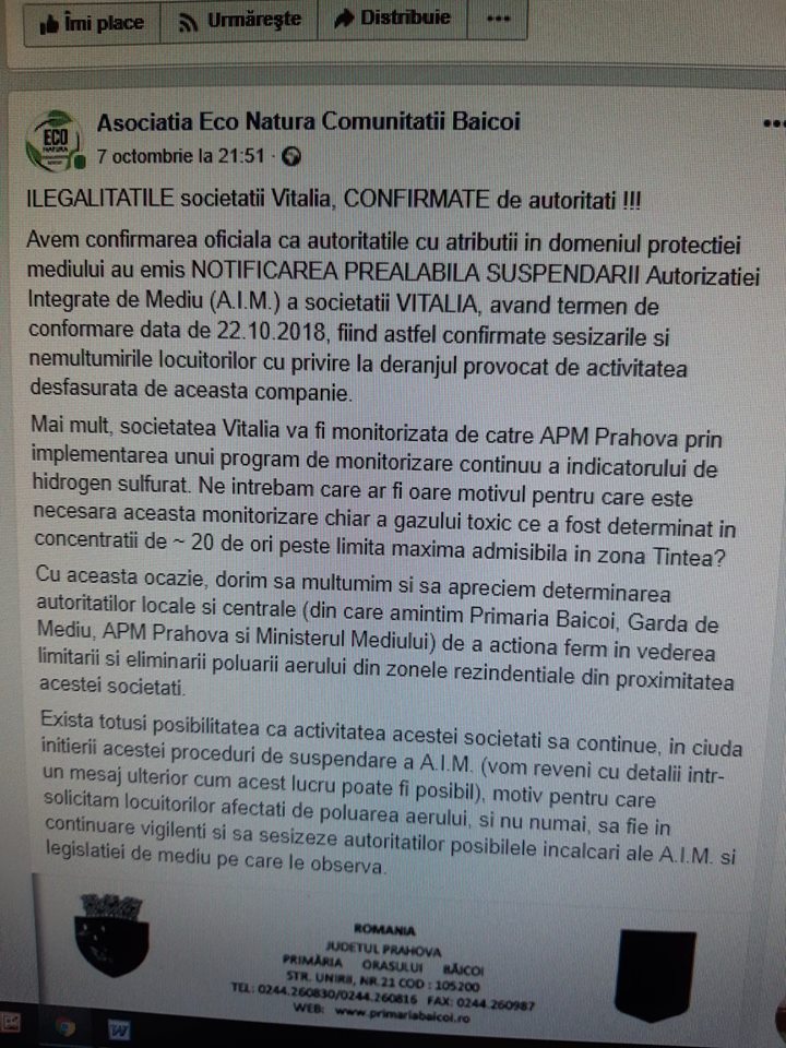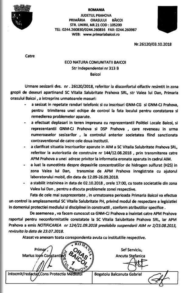 Ca să își ascundă incompetența și indolența cu privire la „vechea problemă” din Valea lui Dan, același primar începe să arate cu degetul: societatea Vitalia, emițînd adresa nr.26120/03.10.2018 în care susține că îi va controla „la sânge” pe cei de la Vitalia. Noi suntem de acord, domnul Constantin să „verificați la sânge”, dar faceți asta după ce ați făcut „curat în propria dumneavoastră ogradă”… după ce rezolvați „intermitențele” emise de OMV Petrom. Nu să le puneți în brațe altora indolența și incompetența dumneavoastră privind poluarea orașului Băicoi! Adică, să răspundă alții pentru tâmpeniile dumneavoastră doar pentru că vă este frică de falși ecologiști ori gigantul petrolier (sau, mai grav, cine știe ce faceți cu fondurile pentru mediu din cadrul Primăriei Băicoi).