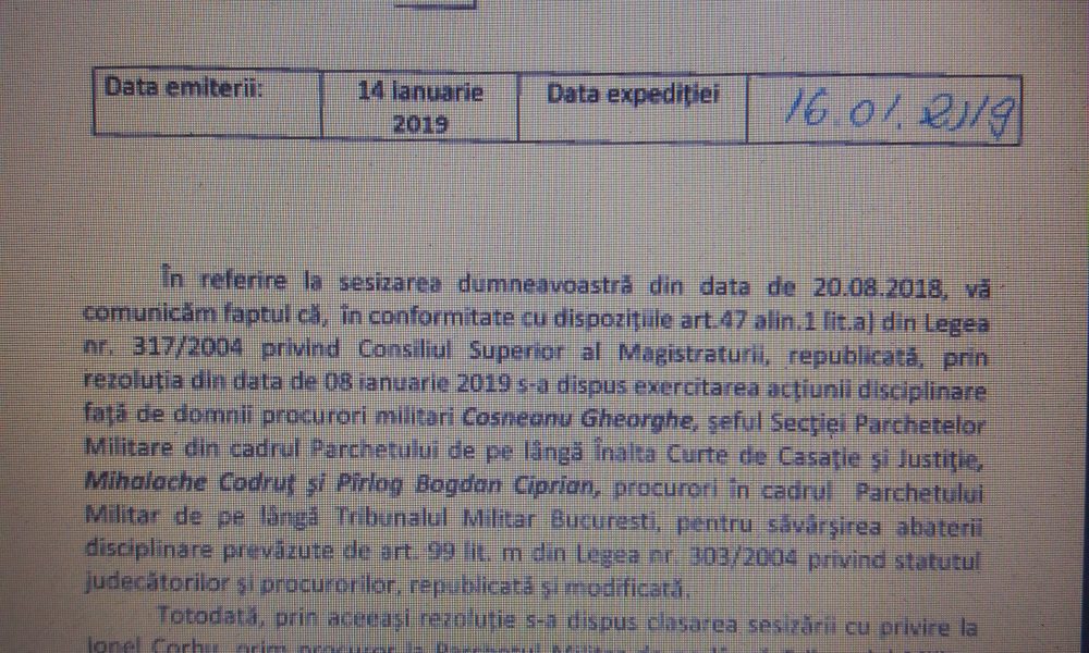 ”Inspecţia Judiciară a exercitat acţiunea disciplinară faţă de procurorii Cosneanu Gheorghe, şeful Secţiei Parchetelor Militare din cadrul PÎCCJ („SPM”), Mihalache Codruţ şi Pîrlog Bogdan Ciprian, de la Parchetul Militar de pe lângă Tribunalul Militar Bucureşti (PMTMB), pentru nerespectarea în mod nejustificat a dispoziţiilor ori deciziilor cu caracter administrativ, dispuse în conformitate cu legea de conducătorul instanţei sau al parchetului, ori a altor obligaţii cu caracter administrativ prevăzute de lege şi regulamente, abatere disciplinară prevăzută de art. 99 lit. m) din Legea nr. 303/2004.