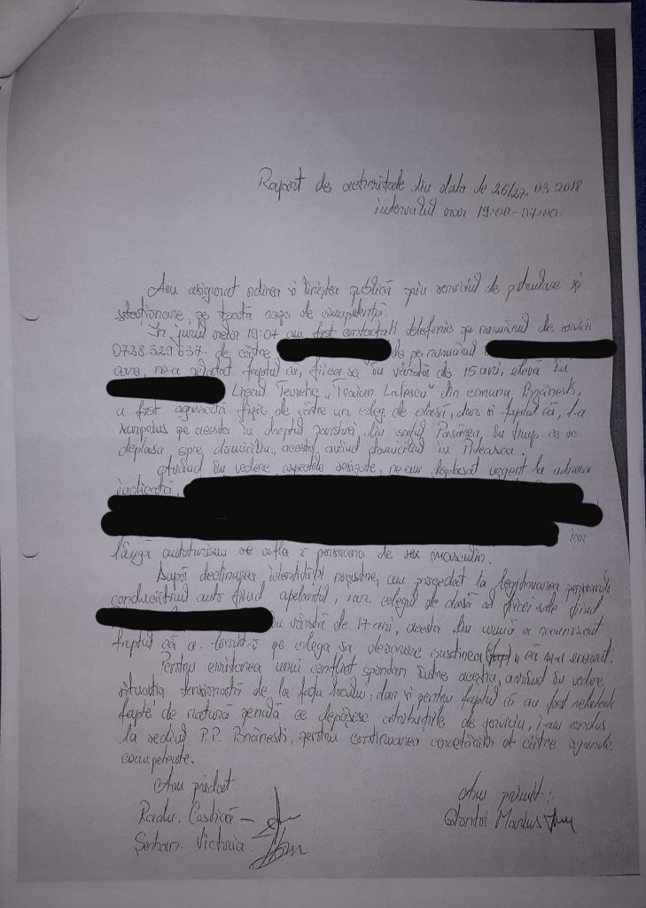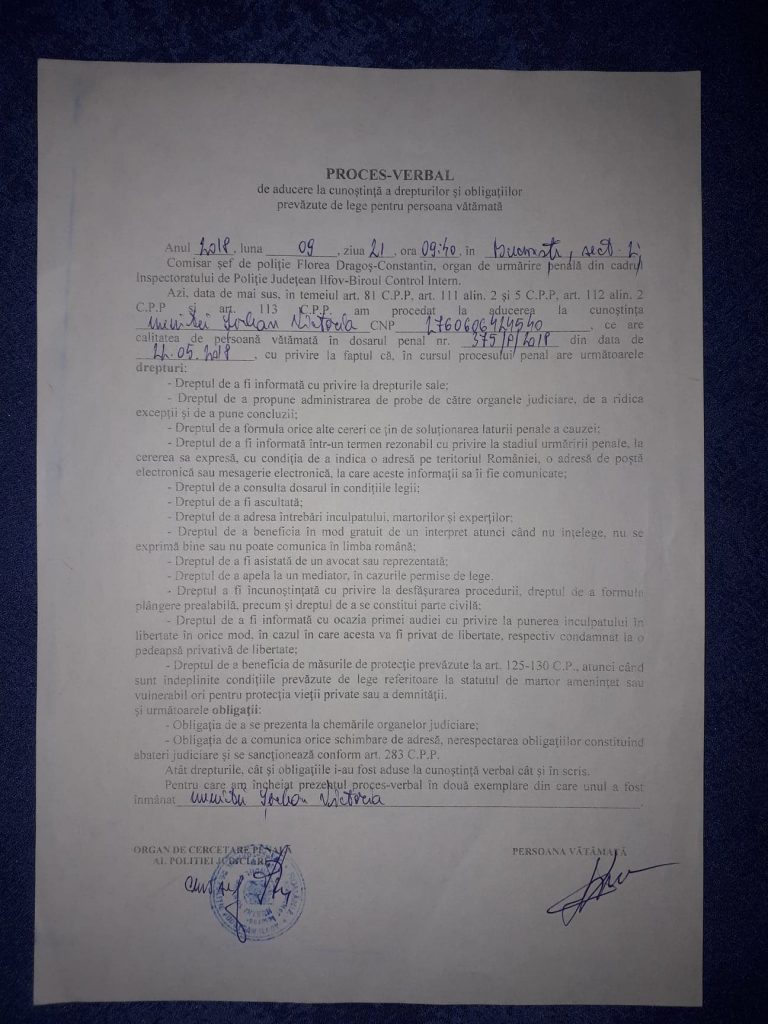 Precizam faptul ca, polițistul ASP Anghel Mihai din cadrul Postului de Poliție Branesti adreseaza aceste injurii cu conotatii sexuale pentru intimidare, fostului sef de post al Politiei Branesti care este sotul politistei locale Serban Victoria de la Politia Locala Branesti, persoana care a fost agresata de acest cadru MAI (ASP Anghel Mihai), dosarul penal fiind pe rolul Parchetului de pe langa Tribunalul Ilfov, inregistrat sub nr 375/P/2018.