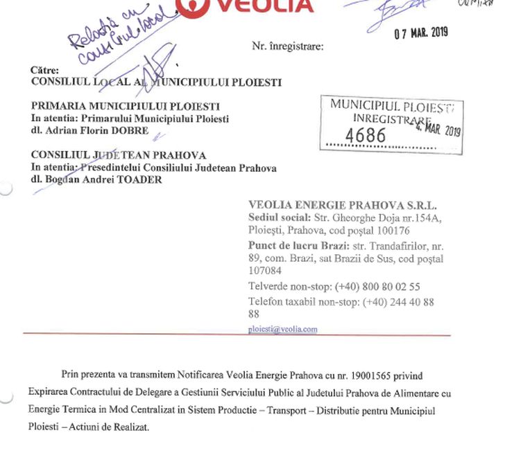 Veolia a notificat Primăria Ploieşti cu privire la încetarea contractului de concesiune a sistemului de furnizare a agentului termic. Într-un document adresat Primăriei Ploieşti şi Consiliului Judeţean Prahova, reprezentanţii operatorului care furnizează energia termică propune un calendar oficial pentru încheierea în bune condiţii a contractului de concesiune.