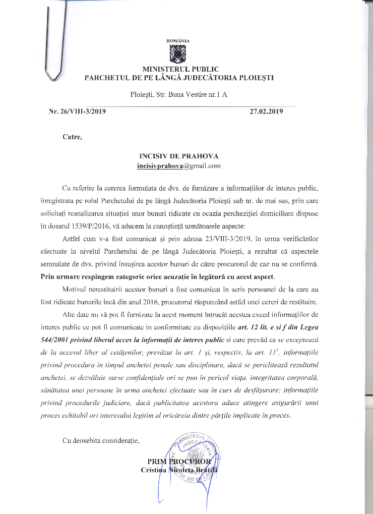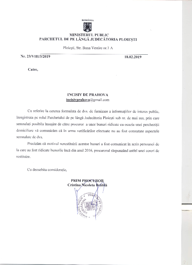 Prin adresa de raspuns nr 23/VIII/3/2019, Parchetul de pe langa Judecatoria Ploiesti a precizat faptul ca: