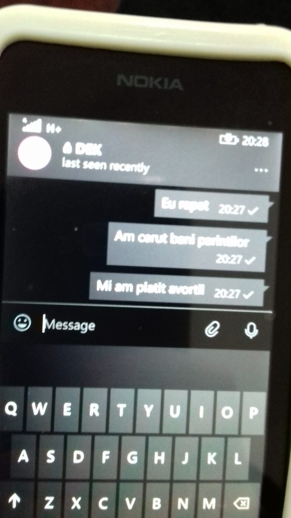 In urma amenintarilor, presiunii si terorizarilor suferite din partea acestui om, barbat si politist, am recurs la intreruperea de sarcina prin metoda avortului medicamnetos, deoarece sarcina era mica.