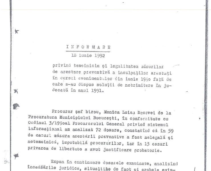 În urma acestor verificări s-a confirmat nelegalitatea măsurilor preventive dispuse, stabilindu-se că dintr-un număr de 72 dosare penale analizate, în 59 măsura arestării preventive a fost nelegală. La finalul cercetărilor, procurorii inspectori din cadrul Procuraturii Municipiului Bucureşti a întocmit raportul S55/I/3 din18 iunie 1992, care constata că cele 1200 de persoane au fost reţinute nelegal, într-un interval cuprins între una şi opt zile în două unităţi militare, motiv pentru care a fost sesizată Direcţia Procuraturilor Militare pentru tragerea la răspundere penală a cadrelor militare dar şi a civililor vinovaţi. Materialului de control a fost trimis şi la Direcţia I a Procuraturii Generale, singura competentă la vremea respectivă să efectueze cercetări asupra procurorilor implicaţi şi a “cauzelor care au determinat această eroare judiciară colectivă”.
