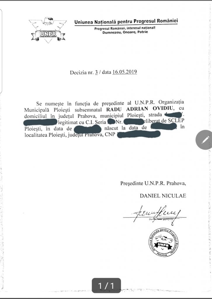 Ofiterul SRI, in rezerva, Ec Adrian Radu a fost numit prin Decizia nr 3 din 16.05.2019 in functia de Vicepresedinte U.N.P.R si Presedinte al U.N.P.R. Organizatia Municipala Ploiesti.