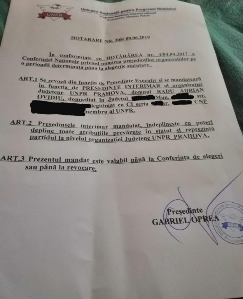 Contactat telefonic, actualul presedinte a confirmat zvonurile potrivit carora, prima decizie a sa va fi demiterea mai multor consilieri locali din Prahova, aspect cu care a informat conducerea UNPR chiar in timpul desfasurarii Congresului.