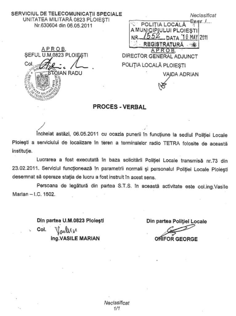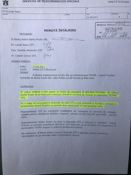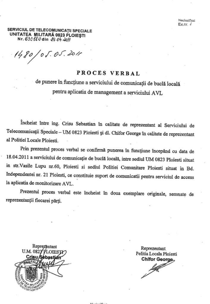 Însă, după cum se vede și în documentul de mai jos, Adrian Vaida avizase procesul verbal prin care se „serviciul funcționează în parametrii normali și personalul Poliției Locale (…) a fost instruit.” Însă, potrivit declarației date în instanță, nu-și reamintea acest lucru. Un Proces Verbal semnat și de colonelul Vasile Marian. Adică cel care în fața organelor de cercetare, sub presiune sau nu, declara că „în ciuda eforturilor tehnice depuse de reprezentanții STS,sistemul AVL achiziționat de Poliția Locală Ploiești nu a putut fi pus în funcțiune”, în timp ce din Minuta întâlnirii reiese contrariul.