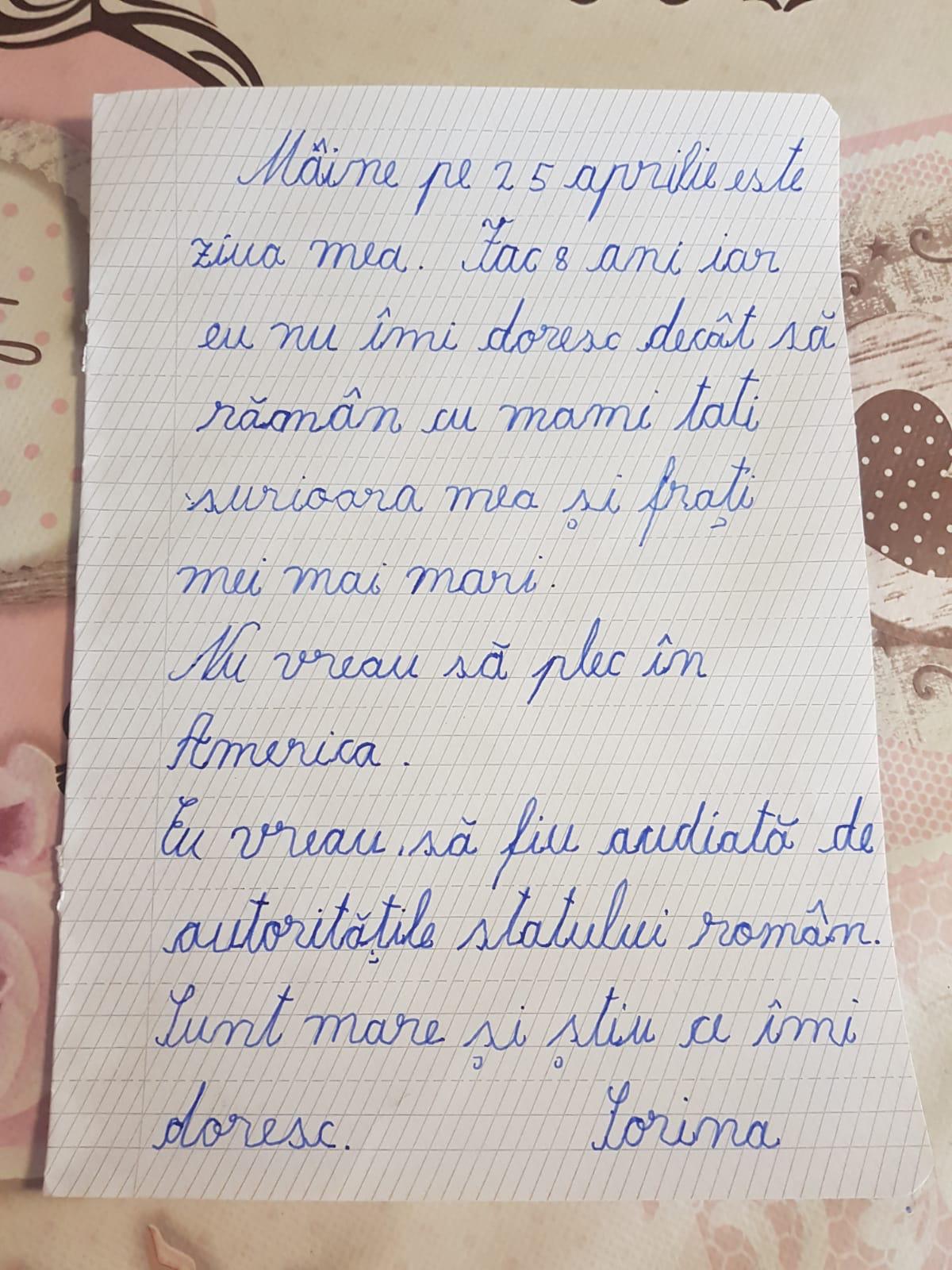 ,, Acum 7 ani, mami cu tati, au luat 2 fetițe in plasament, Andreea și Sorina, după 2 luni de zile, Andreea a fost scoasă la adopție, noi atașându-ne de ele, am pornit demersurile pentru a o adopta, ce a ce am și reușit, cu greu , dar am reușit, doream să o înfiem și pe Sorina, dar ea, încă mai era căutată de părinți și rude, după un timp, nu am mai auzit nimic despre mamă și rude. (Nu le-a mai fost permis sa își vadă fata), așa susțin ei acum. Într-o zi, în 2013, a venit managerul de caz, Morjan Violeta, să dea mami o declarație, chipurile, că nu dorește sa înfieze fata. Mami atunci ia zis contrariului, a zis ca sa facă cum zice ea că știe mai bine, ca și așa ea nu se încadreaza cu veniturile ce le cer ei ca și așa Sorina fiind de etnie rromă nu este căutată, dar noi acum am înțeles de ce a făcut asta, pentru că, toți asistenți maternali din zona cotizau dreptul în fiecare lună, (avem martori), totul a fost cum a vrut doamna până când într-o zi, în 2016, a venit la fel cu o altă cerere scrisă ca tot nu o înfiază . Însă, după un timp, pe 19 februarie 2018, a venit într-o dimineață, să ne zică, că trbuie să pregătim fata, fiindcă vine o familie de români, stabiliți în America de 15 ani și ca o vor ei pe Sorina, fata și noi când am auzit am refuzat și am luat-o la întrebări, pe doamna Morjan, de ce nu nea spus că fata era scoasă la adopții?