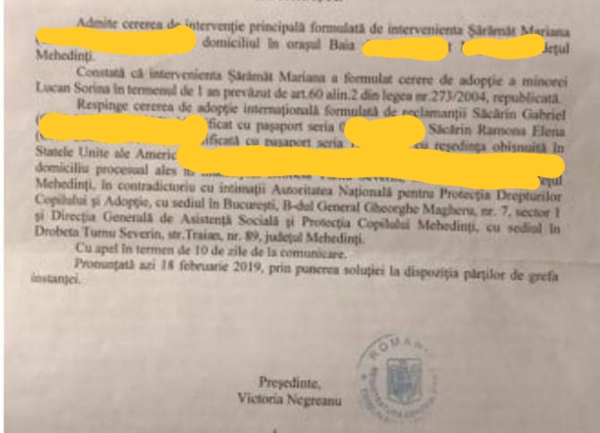 Cum am aflat, imediat am început demersurile pentru a o înfia noi, dar n-i sa răspuns cacă, momentan fata este blocată la familia aceea și ca noi nu mai avem nici un drept. Cum când noi am crescut-o? Am mers chiar și la director să îi zicem, cum nea mințit, dar ne zis că sunt presiuni de la București, chiar și de la Ambasada Americană.
