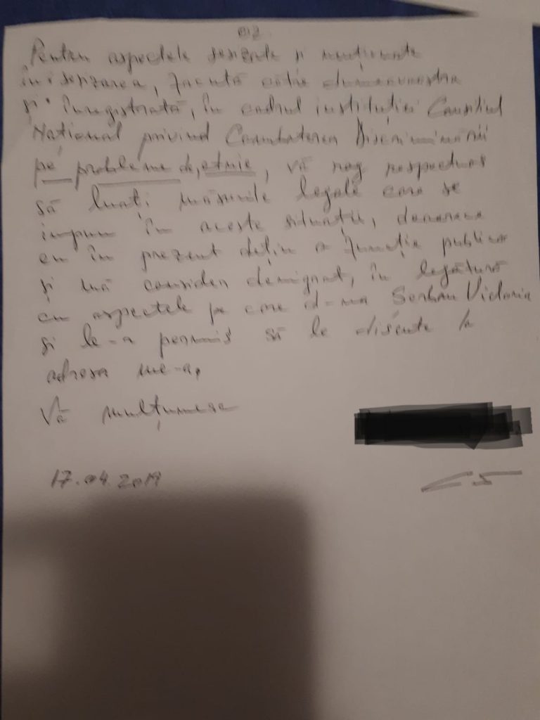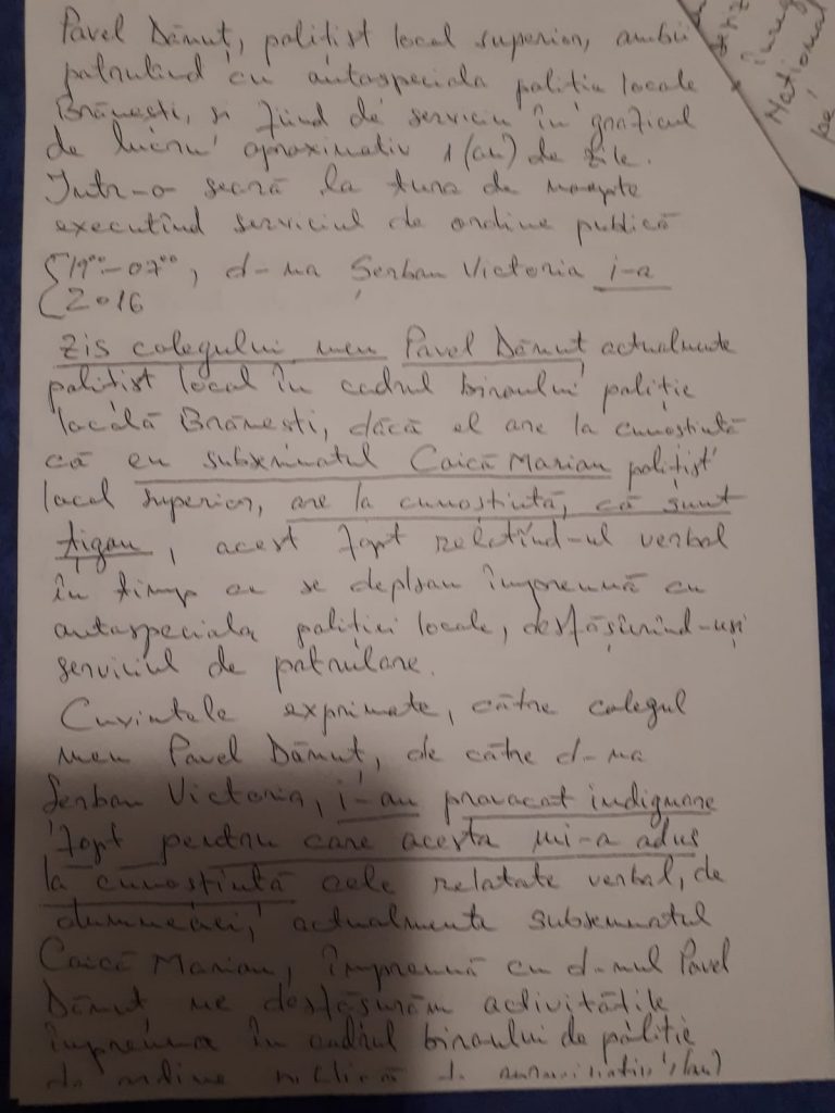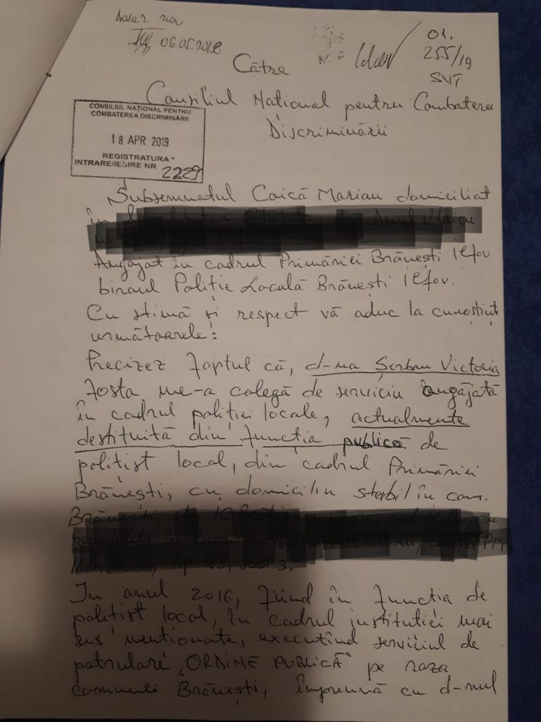 Ceea ce ne-a atras atenția în mod deosebit la acest individ a fost faptul că, si-a folosit prerogativele funcției publice intr-o sesizare din cadrul CONSILIULUI NAȚIONAL PENTRU COMBATEREA DISCRIMINĂRII, sesizare care a intrat în posesia noastră , pe care o prezentăm opiniei publice pentru formarea unor păreri, deoarece din punct de vedere gramatical exprimarea acestui polițist local lasă de dorit.