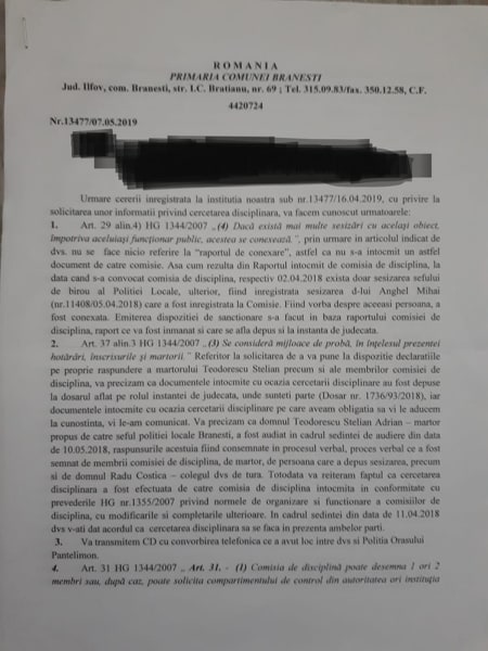 Prezentul raspuns dat de mai marii Primăriei Brănești se referă la interceptarea fără drept pe care au acceptat-o ca mijloc de probă în cercetarea disciplinară a polițistului local Serban Victoria din cadrul Poliției Locale Brănești, ocazie în care ” lupul moralist ” … șeful de post Teodorescu Stelian Adrian a avut calitatea de martor și așa cum bine știți, s-a dispus destituirea din funcție polițistului local (pe o probă ilegală) …