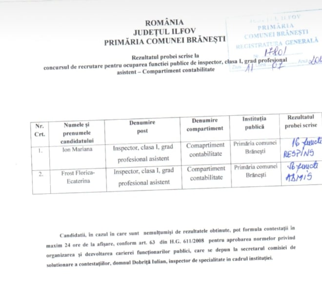 Angajarea doamnei Frost Florica Ecaterina pe lângă faptul că a fost „pe șest ” …. pur și simplu trebuia „să fie în cărți ” ….se poate observa cu ochiul liber nivelul ” ridicat” de pregătire…..având în vedere punctajul obținut….. Cum putem să mai vorbim de integritate morală în această comună, domnilor……având în vedere faptul că, este vizibil, ceea ce afirmăm de la începutul investigațiilor …sintagma „…..noi /ai nostri ……pardon…..voi cu ai voștri….. Să mai vorbim despre respectarea întocmai a legii în acest sens? Nici vorbă de așa ceva …..cine să-i tragă la răspundere dacă însuși Primarul în funcție nu respectă legea. Apropo’ că tot am amintit de edilul comunei…..urmează să vă prezentăm raspunsul dat și semnat de dumnealui cu privire la încălcarea legii pe care a săvârșit-o…hai să fim înțelegători să spunem că poate nu a știut…(urmează să vă dezvaluim ce au hotărât organele de cercetare penală, în acest caz)…