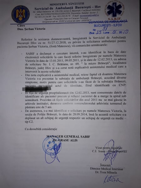 Asistenta medicală este soția domnului Sîrbu Liviu, un fost șef al polițistului local,atunci când ambii activau intr-o altă structură (S.P.P.O.I.J. ILFOV) iar doamna asistentă își desfășura activitatea ( chiar și în prezent) la Micro Stația Brănești, situată în incinta Primăriei Brănești, județul Ilfov. Se pare ca o perioadă destul de îndelungată cele două doamne își desfășurau activitatea pe aceeași tură în locul mai sus indicat. Nimic ieșit din comun dar, doamna asistentă și-a făcut un obicei de a declara cazuri fictive cu diagnostic diferit ori de câte ori avea „ocazia „.