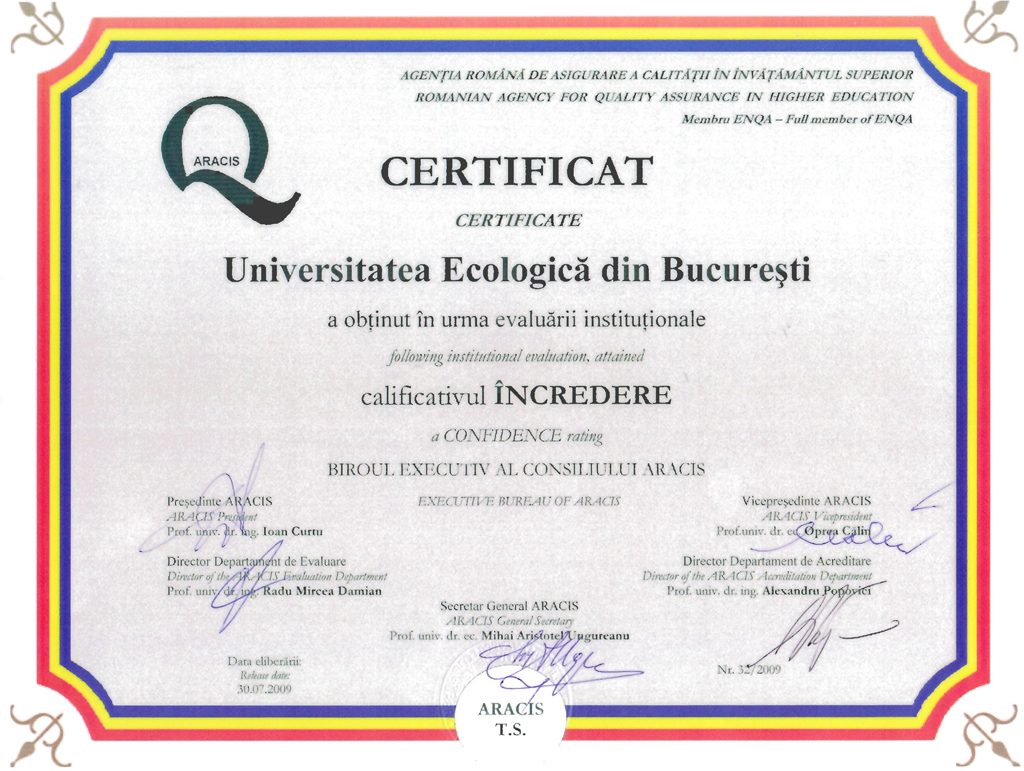 Universitatea Ecologica din Bucuresti a fost evaluata institutional in anul 2017 de catre Agentia Romana de Asigurare a Calitatii in Invatamantul Superior (ARACIS) cu privire la modul in care sunt indeplinite criteriile si standardele academice. In urma evaluarii a obtinut calificativul: INCREDERE.
