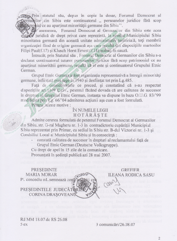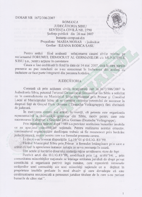 Cu vadita incalcare a legii si in dispretul oricarui rationament logico-juridic, judecatoria Sibiu a admis cererea Forumului Demogratic al Germanilor din Sibiu, constatand “calitatea de succesor in drepturi al reclamantului [FDGS] fata de Grupul Etnic German”.