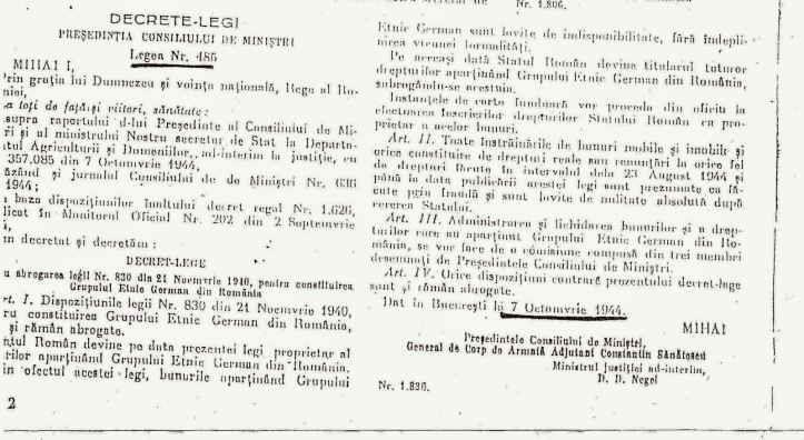 Prin Decretul–lege nr. 485/1944 s-a abrogat Legea nr. 830/1940 şi s-a prevăzut că Statul român devine titularul tuturor drepturilor aparţinând Grupului Etnic German din România, subrogându-se acestuia, urmând ca instanţele de carte funciară să procedeze din oficiu la efectuarea înscrierilor drepturilor Statului Român ca proprietar al acelor bunuri.