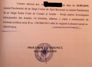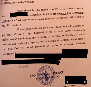 Achiesând la solicitarea avocatului și Inducând la rândul lui ,,în eroare” instanța de judecată, procurorul șef adjunct Nicolae Marin transmite către instanța civilă, prin fals și uz de fals, în data de 19 septembrie 2019, o legalizare a unei copii cu următorul text: ,,originalul se află la dosarul penal 1003/P/2016” și transmite copie după ,,originalul” aflat la acel dosar. Modul în care a fost confecționată ,,copia după original” este deasemenea grăitor. Dar iată adresa prin care procurorul șef Nicolae Marin, minte instanța civilă: