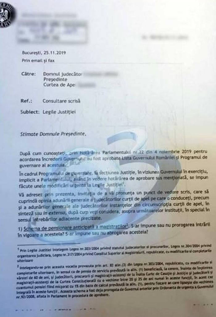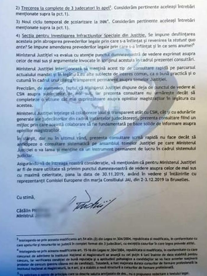 Printr-o adresa trimisa in 25 noiembrie 2019 tuturor instantelor si parchetelor din tara, ce are ca subiect „consultarea scrisa” pe Legile Justitiei, ministrul Catalin Predoiu le cere magistratilor sa se pronunte, pana pe 30 noiembrie 2019 (adica intr-un termen de 5 zile) pe mai multe aspecte de importanta in sistemul judiciar, respectiv: