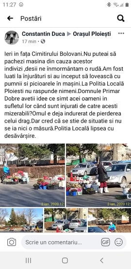 „Ieri in fața Cimitirului Bolovani. Nu puteai să pachezi masina din cauza acestor indivizi, desi ne înmormântam o rudă. Am fost luati la înjurături si au inceput să lovească cu pumnii si picioarele în mașini. La Politia Locală Ploiesti nu raspundea nimeni. Domnule Primar Dobre aveti idee ce simt acei oameni in sufletul lor cănd sunt injurati de catre acesti mizerabili?