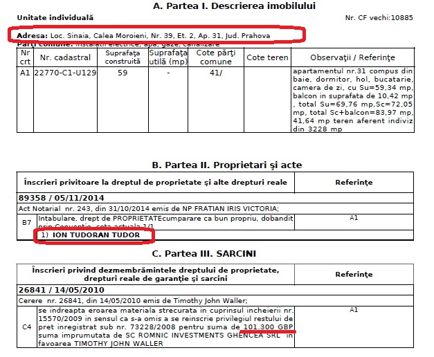 La data de 5 noiembrie 2014, fiul cel mic, Tudor Ion-Tudoran, a cumpărat în Sinaia, în complexul Izvorul Dorului, apartamentul numărul 31 plus un garaj. Conform înscrisului de la ANCPI, proprietatea fusese evaluată anterior la suma de 101.300 lire sterline. Înscrierea apartamentului din Sinaia pe numele fiului cel mic, Tudor Ion-Tudoran (vezi extras informare ANCPI Sinaia), de profesie mediator, a fost una de fațadă. Căci acesta nu a avut niciodată suma necesară achiziției. Fapt ce îl poate verifica orice procuror.