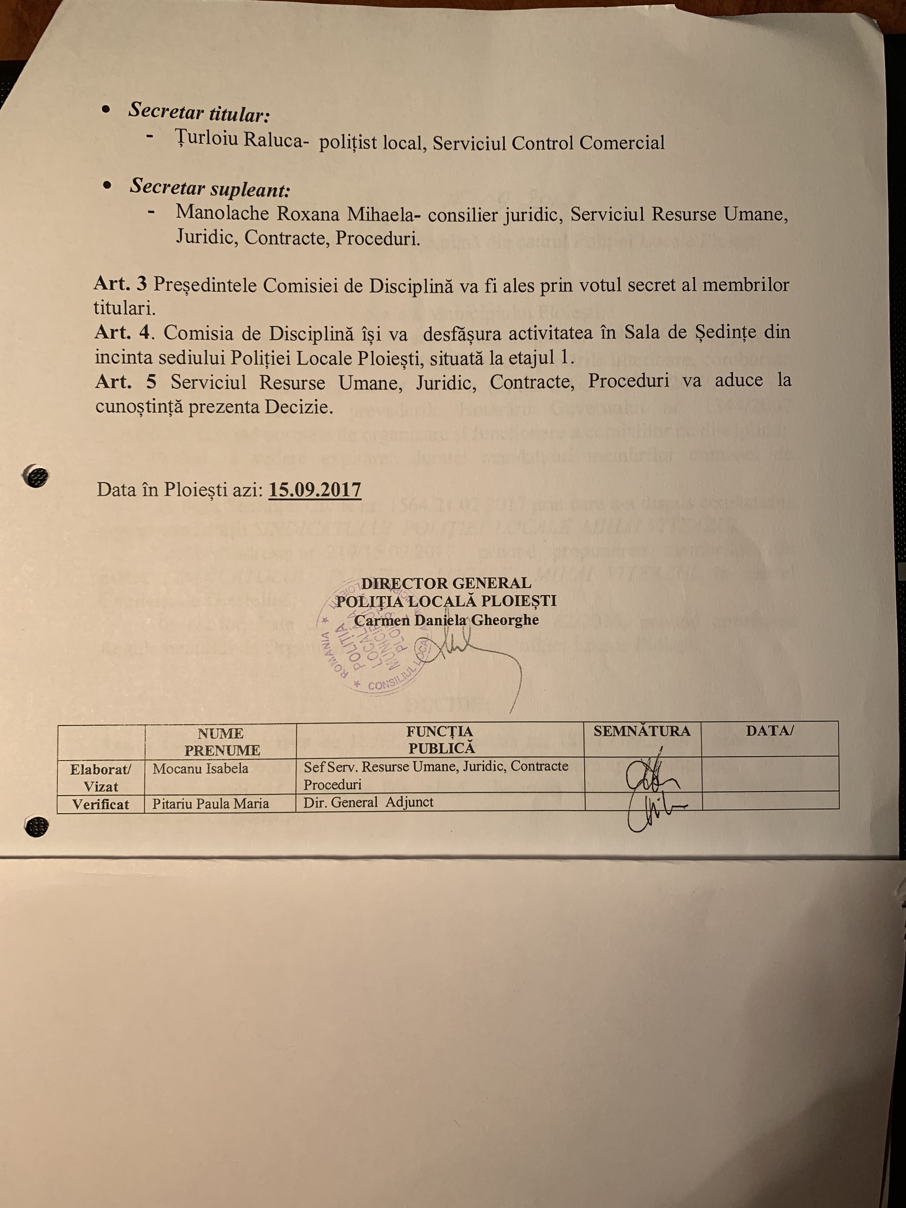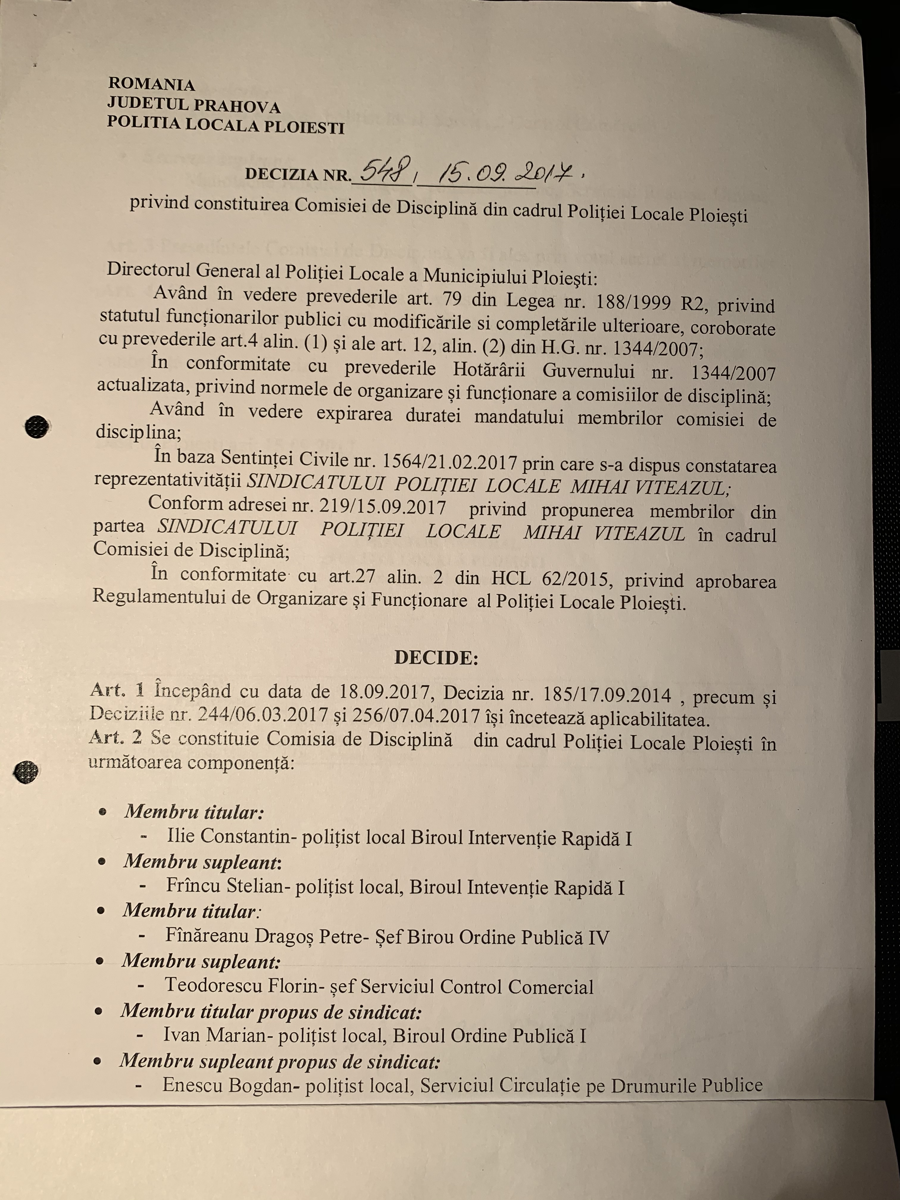 La nivelul Politiei Locale Ploiesti exista o Comisie de Disciplina, legal constituita, prin decizia nr 548/15.09.2017, in conformitate cu art 27 alin 2 din HCL 62/2015 privind aprobarea Regulamentului de Organizare si Functionare al Politiei Locale Ploiesti.