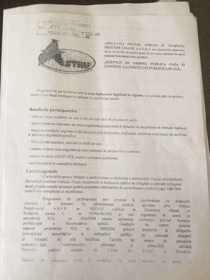 Astfel, printr-o adresa (probabil transmisa prin e-mail), ALBU FELICIA ISABEL (care indica calitatea de „coordonator formare”) aduce la cunostinta conducerii Politiei Locale Ploiesti ca hotelul „RALUCA” din statiunea Venus nu ofera conditii corespunzatoare de cazare si masa, motiv pentru care cursurile din perioada 26.07 – 02.08.2015 au fost relocate la hotelul „DELTA” din Jupiter care – pentru buna desfasurare a cursurilor de perfectionare profesionala pe profil ordine publica si paza / control obiective – a oferit: