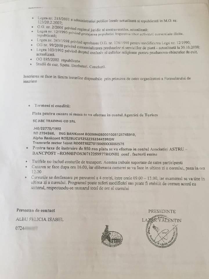 – cea cu nr. 1648/01.07.2015 a ASOCIATIEI PENTRU SPRIJIN SI TRAINING RESURSE UMANE (A.S.T.R.U.), care nu are mentionate datele de identificare[2], semnata de LAZAR VALENTIN – presedinte si aceeasi ALBU FELICIA ISABEL – persoana de contact cu telefon 0724(******) (care ofera locatii in Eforie Nord – hotel „IBIZA”, Saturn – hotel „CERNA” si Cap Aurora – hotel „MAJESTIC”);