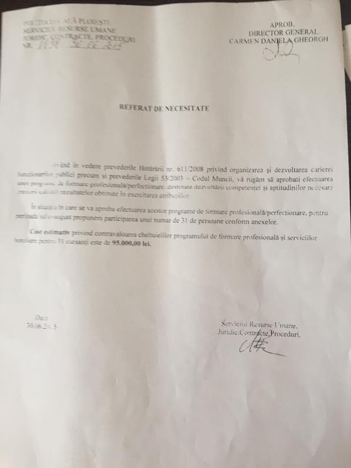 Prin REFERATUL DE NECESITATE nr. 1098 / 30.06.2015, semnat indescifrabil pentru sef Serviciu resurse umane, juridic, contracte, proceduri, s-a solicitat si obtinut aprobarea pentru efectuarea de catre 31 cursanti, in perioada iulie – august 2015 (cu mentiunea „conform anexelor”) a “unor programe de formare profesionala/perfectionare, destinate dezvoltarii competentei si aptitudinilor necesare cresterii calitatii rezultatelor obtinute in exercitarea atributiilor”, costul estimativ fiind de 95.000,00 lei.