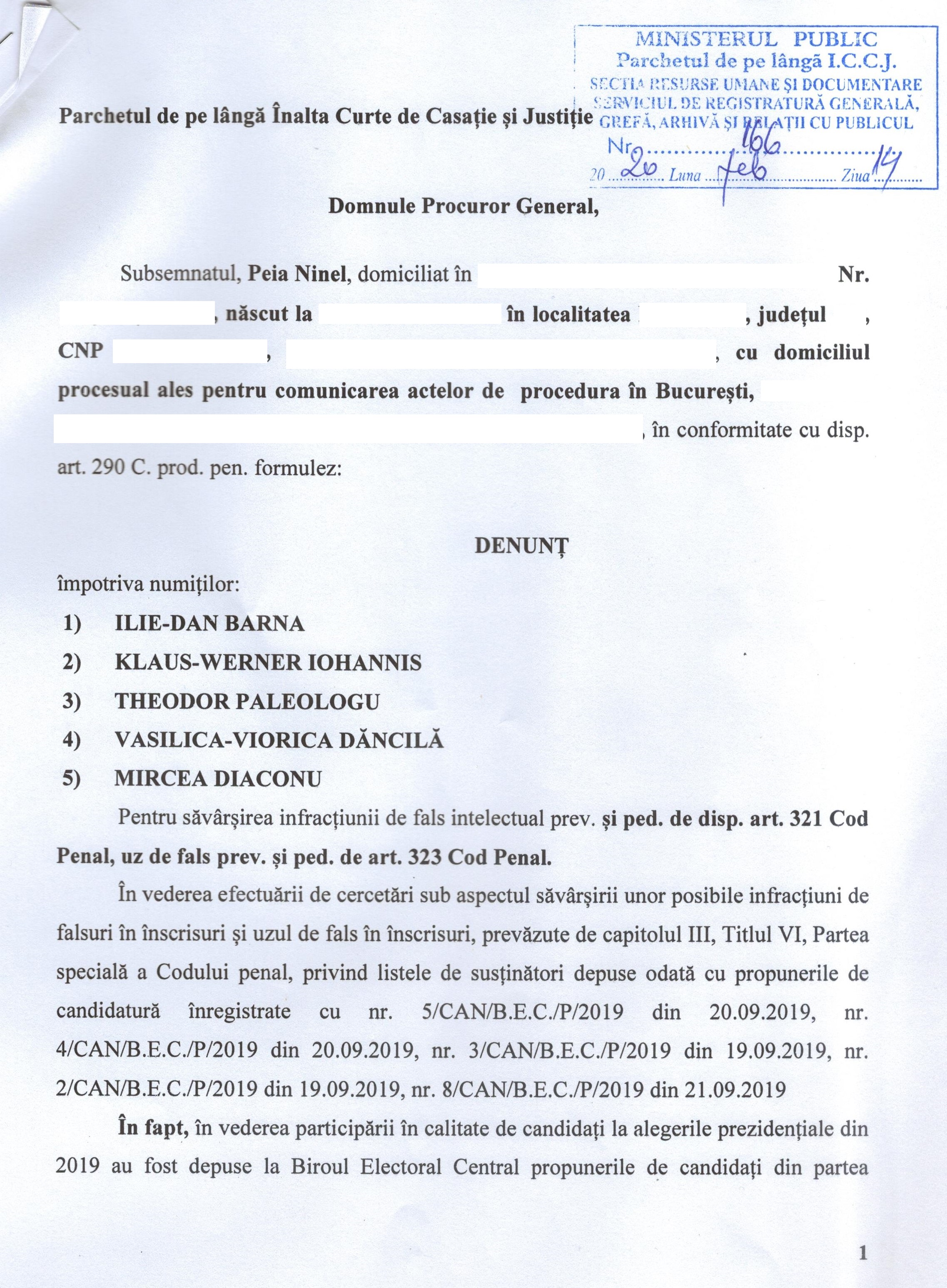 DENUNȚ penal împotriva numiților: ILIE-DAN BARNA, KLAUS-WERNER IOHANNIS, THEODOR PALEOLOGU, VASILICA-VIORICA DĂNCILĂ SI MIRCEA DIACONU