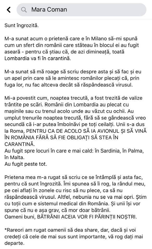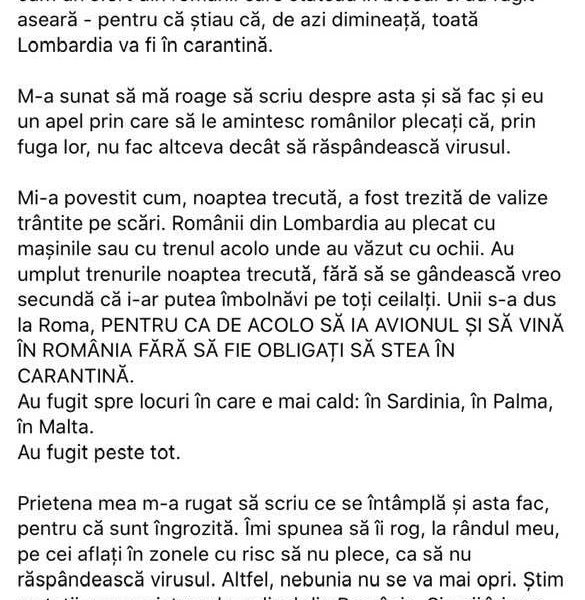 „Diaspora se întoarce în țărișoară… acum nu le mai puțim, nu mai suntem corupți, proști, bisericoși și hoți. Mulți dintre ei eludează regulile, o iau prin alte țări și/sau declară în fals la graniță că nu vin din zonele afectate. Nu stau în carantină, că de acasă nu pot să își dea ochii peste cap prin mall-uri. Este infracțiune, dar nici nu contează asta atât de mult, ci mult mai grav este că pun în pericol viața co-naționalilor lor. Desigur, merită să crape, în viziunea lor, că mulți dintre cei care crapă sunt bătrâni, cu #ciumaroșie, deci e bine că se reduce electoratul PSD.