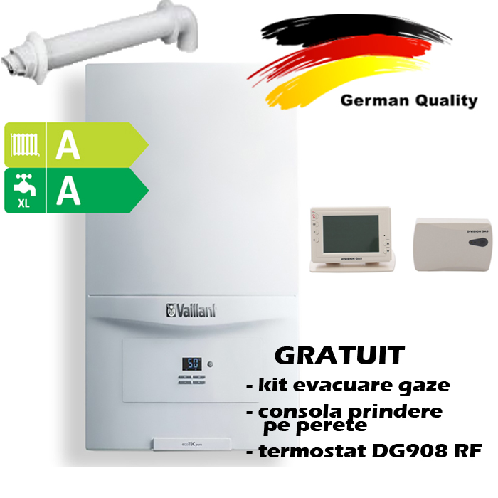 Centrala termica Vaillant ecoTec pure VUW 236/7-2 face parte din aceeași gamă, Pure, pentru încălzire și apă caldă menajeră. De putere mai mică, 20.2 kW, funcționând în condensare, echipamentul este util pentru apartamente și case cu suprafețe de până la 160 mp.