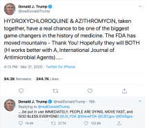 ,,Hydroxychloroquine & Azihromycin, luate împreună, au o șansă reală să fie una dintre cele mai mari idei din istoria medicinii. FDA (Food & Drug Administration a muntat munții – Mulțumesc! Sperăm că amândouă (H funcționează mai bine cu A, International Journal of Antimicrobial Agents)… vor fi folosite IMEDIAT. Oamenii mor, mișcați-vă repede și Dumnezeu să binecuvânteze pe toată lumea”, a scris Donald Trump pe twitter, în 21 martie 2020.