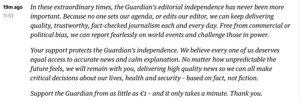 Ca sa va faceti o idee cum ,,presa” nu mai poate pretinde ca nu a devenit sluga Guvernului in urma actiunii, cu iz penal in opinia mea, de cumparare in esenta a politicii editoriale a televiziunilor cu 200 de milioane de lei, din bani publici, sub pretextul pandemiei (in fapt specularea pandemiei din bani publici in interes electoral si cumpararea bunavointei patronilor, astfel incat Orban sa nu mai riste vreun caz UTI), este suficient sa priviti doar cum au fost reflectate ieri mesajele privind ce se va intampla dupa starea de urgenta cu economia, cu populatia si care sunt scenariile. Pentru ca nu a fost transmis niciun mesaj coerent, nici pentru populatie, nici pentru companii (cu doar 4 zile inainte de ridicarea starii de urgenta), presa de protocol, care se inghesuie la mita din bani punlici, prezinta in locul adevarului – niciun mesaj concret pentru populatie si companii despre cum se redeschide economia – sub titlul – aproape identic: ,,Am emis Ordonanta militara numarul 11”. Cu mici variatii, este acelasi titlu si la Mediafax si la hotnews si la Digi24. Stirea nu poate fi vreodata ca a fost emisa Ordonanta Militara 11, ci in mod real care este impactul cel mai mare pentru cea mai mare parte a populatiei, asa cum CNN a dat stirea dupa anuntul lui Boris Johnson: ,,Johnson eases UK lockdown”. Obisnuiti-va cu titlurile astea de protocol, cel putin pana cand DNA va fi obligata sa iasa din somaj tehnic si sa investigheze mecansimul prin care se sifoneaza 200 de milioane de lei din bani publici pentru a fi cumparata presa, in scop electoral, la scutul pandemiei. Si inca ceva: in vremuri tulburi, presa de calitate se bazeaza pe CITITORI, și nu se intoarce cu fundul spre guvern, ca in Romania (am atasat si disclaimer-ul de la The Guardian), precizeaza analistul Radu Teodor Soviani. (Cerasela N.).