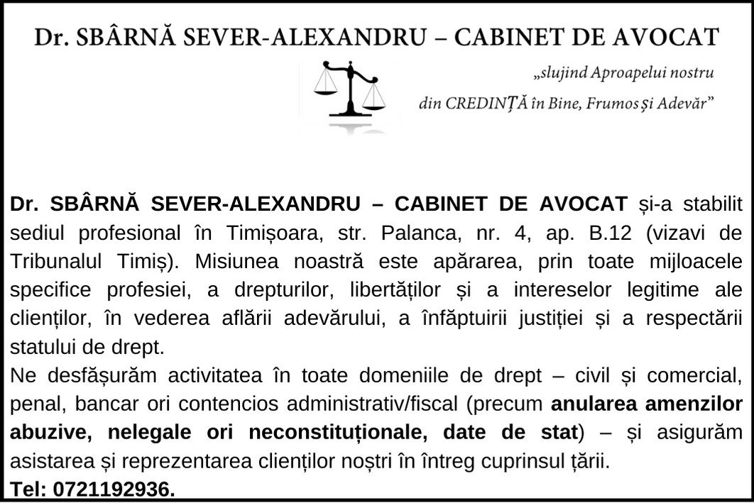 Dr. SBÂRNĂ SEVER-ALEXANDRU – CABINET DE AVOCAT și-a stabilit sediul profesional în Timișoara, str. Palanca, nr. 4, ap. B.12 (vizavi de Tribunalul Timiș). Misiunea noastră este apărarea, prin toate mijloacele specifice profesiei, a drepturilor, libertăților și a intereselor legitime ale clienților, în vederea aflării adevărului, a înfăptuirii justiției și a respectării statului de drept.