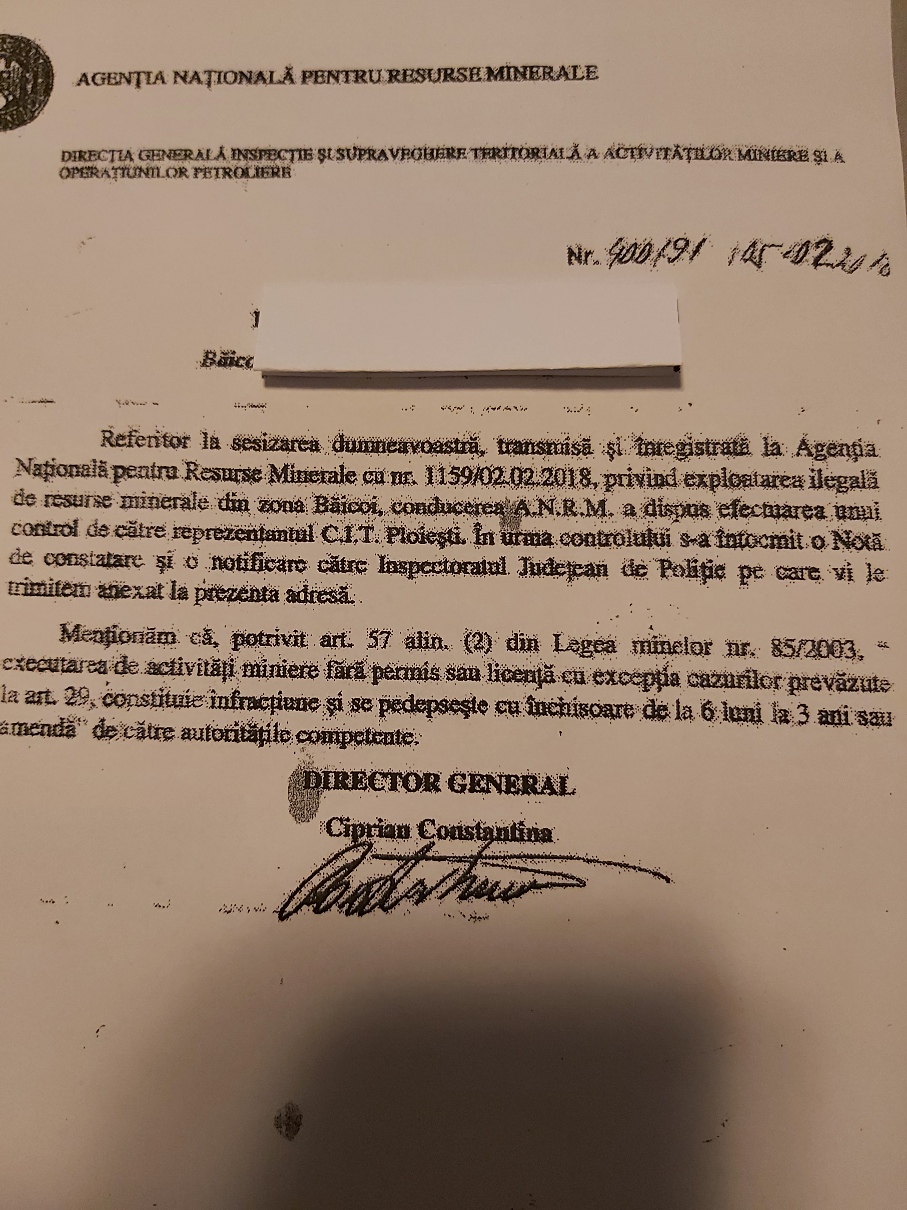 2. Executie de lucrari si exploatarea ilegala de resurse de piatra si nisip s-au efectuat fara un permis de exploatare, context in care ANRM a procedat la comunicarea & aducerea la cunostinta a organelor competente, respectiv: ANRM Bucuresti, Compartimentul de Inspectie Teritoriala Ploiesti-Prahova, Inspectoratul Judetean de Politie Prahova etc.