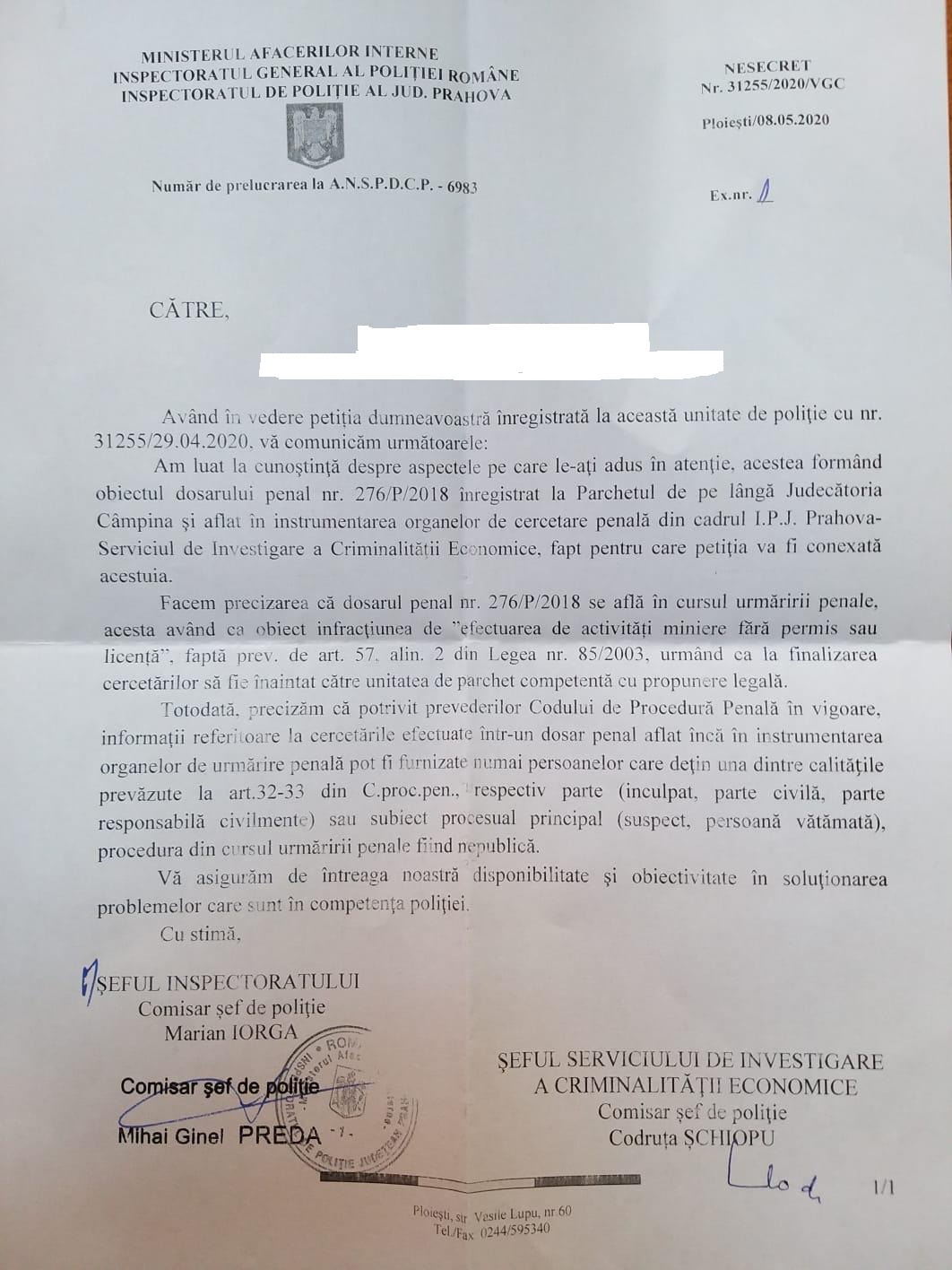 Astfel, IPJ Prahova, prin reprezentantii erijati in calitatile oficiale de sefi ai institutiei, respectiv Preda Mihai Ginel-comisar sef de politie (semnand in locul domnului Marian Iorga) si Codruta Schiopu-comisar sef de politie, seful serviciului de investigare a criminalitatii economice, au formulat un raspuns prin care indica faptul ca, dupa mai bine de doi ani, dosarul care include speta Statescu Gh. Ciprian s-ar afla, in continuare, in faza de urmarire penala, tot la acest serviciu, mai-sus mentionat, cu precizarea ca nu a fost finalizat, motiv pentru care, nu a fost transmis unitatii de parchet cu o propunere de solutie legala, in termenele prevazute de lege, in vederea confirmarii sau infirmarii propunerii in cauza.
