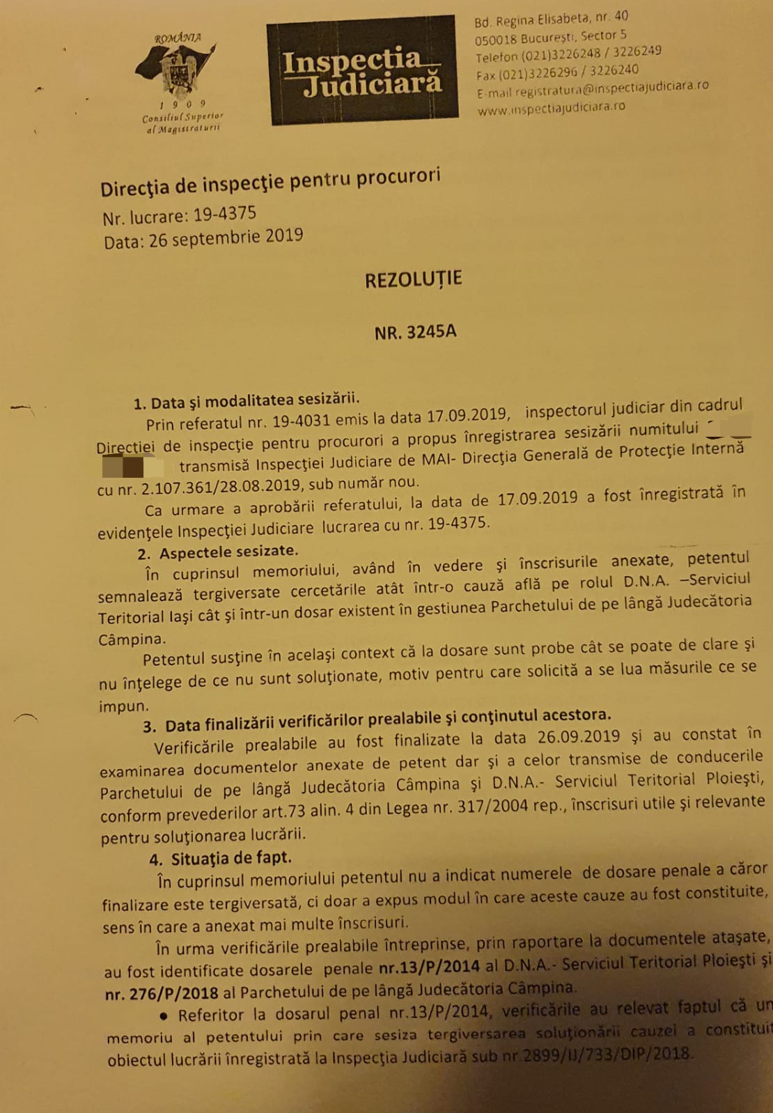 Aceste aspecte demonstreaza si dovedesc intarzierea mare si modul greoi de lucru care, intamplator sau nu, zadarniceste procesul de cercetare in dosar, raportat la refuzul sistematic al cadrelor de politie de a asuma o asemenea solutie legala, oricare ar fi aceea, vizandu-se, probabil, prescrierea faptelor care pot fi retinute in sarcina persoanlor responsabile, in ceea ce priveste savarsirea unor infractiuni, in pofida faptului ca CSM, prin INSPECTIA JUDICIARA, Sectia pentru Procurori, la data de 26.09.2019, a dat o rezolutie, NR. 3245 A, in care a formulat clar si explicit, indrumari unitatii de parchet cu atributii si competente in DOSAR, stabilind un termen de finalizare a probatoriului, la data de 24.10.2019. Acest raspuns intarziat este confirmat chiar de corespondenta IPJ Prahova care, de acum, constituie un document oficial, pe masa CONSILIULUI SUPERIOR AL MAGISTRATURII, precum si al altor institutii.