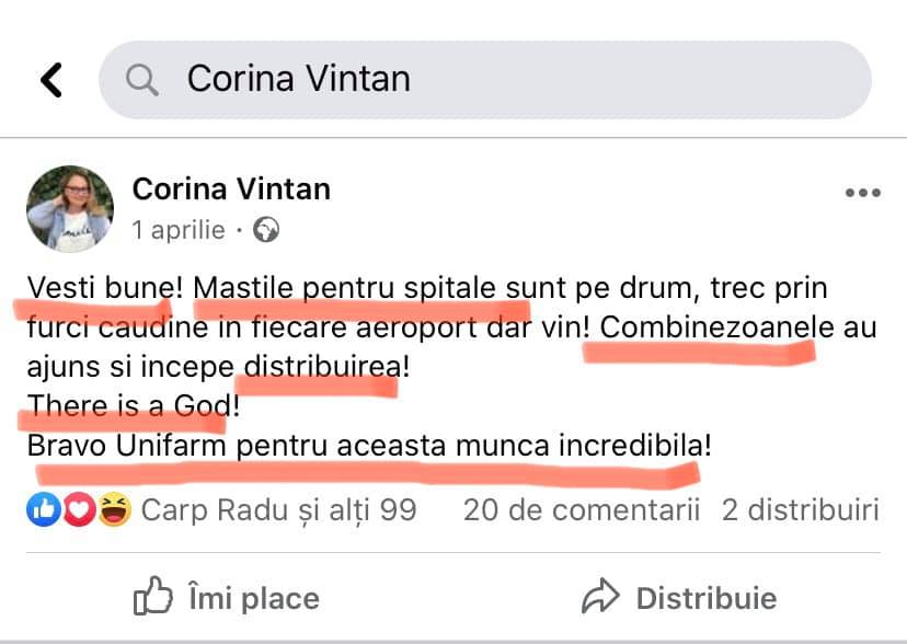 „Din cauză că societatea comercială furnizoare nu a achitat intermediarului nicio sumă din procentul de 18 % convenit , inculpatul Ionel Eugen Adrian, în calitate de director general al C.N. Unifarm S.A a decis rezilierea unilaterală a contractului. Din totalul echipamentelor conţinute în contract a fost livrată şi plătită doar o parte, respectiv 1 milion de măşti (care de altfel nu corespundeau specificaţiilor tehnice) şi 26.000 de combinezoane”, mai transmite DNA.