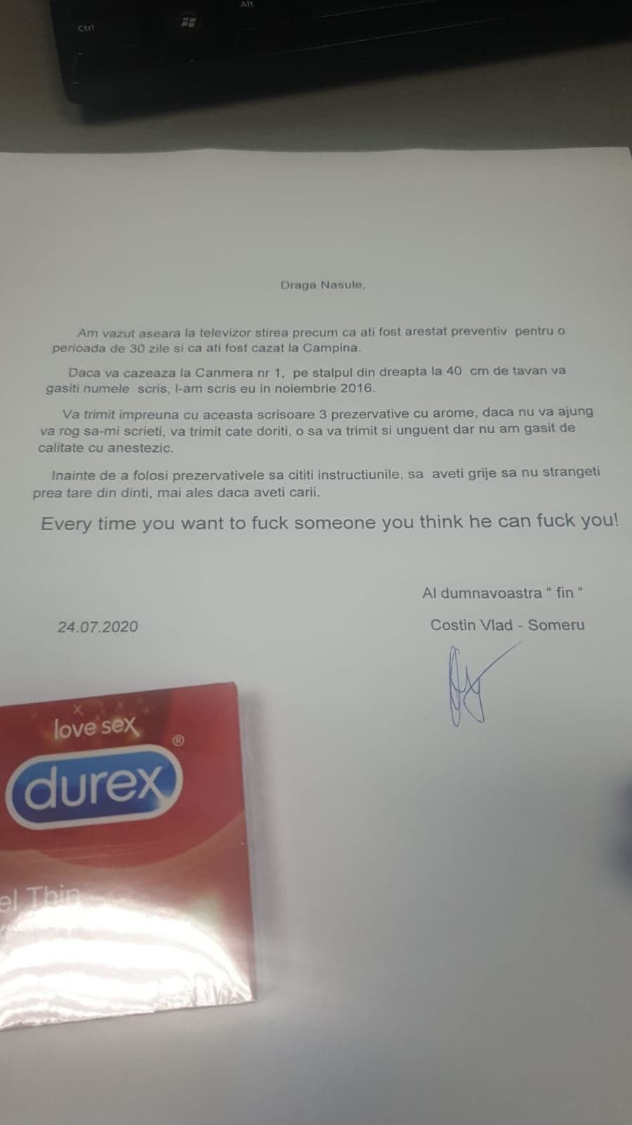Vizibil ingrijorat de starea deplorabila in care a ajuns fostul paraditor de destine, inca de la orele 08.00, Vlad Constantin i-a trimis o scrisoare de incurajare si cateva echipamente de protectie sanitara folositoare in opinia sa, in perioada de arest.