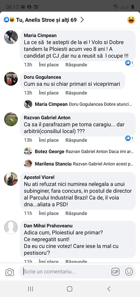 „Un anume candidat la Primaria Ploiesti care intentioneaza sa se intoarca pentru a plati datoriile pe care le-a facut in contul Ploiestiului in mandatul sau anterior a inceput sa miste pe retelele de socializare si sa isi regleze conturile cu colegul sau de partid, actualmente primar la Ploiesti ! Nu imi cereti nume,ca nu dau ! Si cum acest razboi fratricid se poarta prin intermediul unor consilieri locali de mare onoare si caracter ( pe principiul : sunt cu cel care imi ofera mai mult ), susnumitul s-a gandit el ( cu capul lui ) ca subsemnatul am fost arogant si nepotrivit ironic atunci cand le-am spus, ca presedinte de sedinta in consiliul local, brutusilor galbeni sa termine cu circul in sedinta si sa intrebe primarul in particular ce ar vrea sa faca cu banii Ploiestiului, urmand sa discutam in comisii. Nu de alta, dar le luai spumele gandirii cu polonicul de pe podeaua stabilimentului !