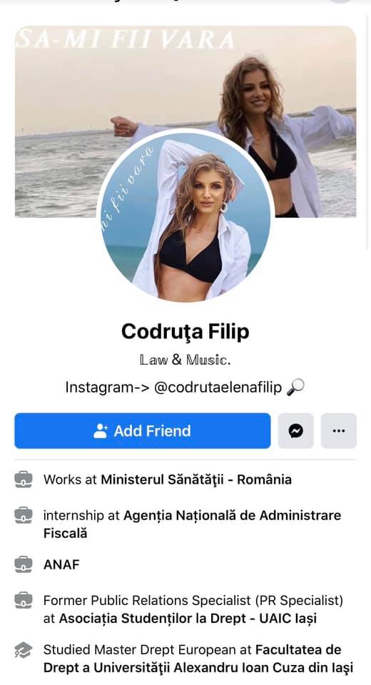 Presa mondenă a relatat în primăvara acestui an că tânăra Codruța Filip s-a născut în localitatea Tătăruși, dar locuiește în Iași. După absolvirea liceului Pedagogic „Vasile Lupu” și-a continuat studiile la Facultatea de Drept din cadrul Universității „Alexandru Ioan Cuza” din Iași. Apoi a urmat cursurile unui master în Drept European. (Cerasela N.).
