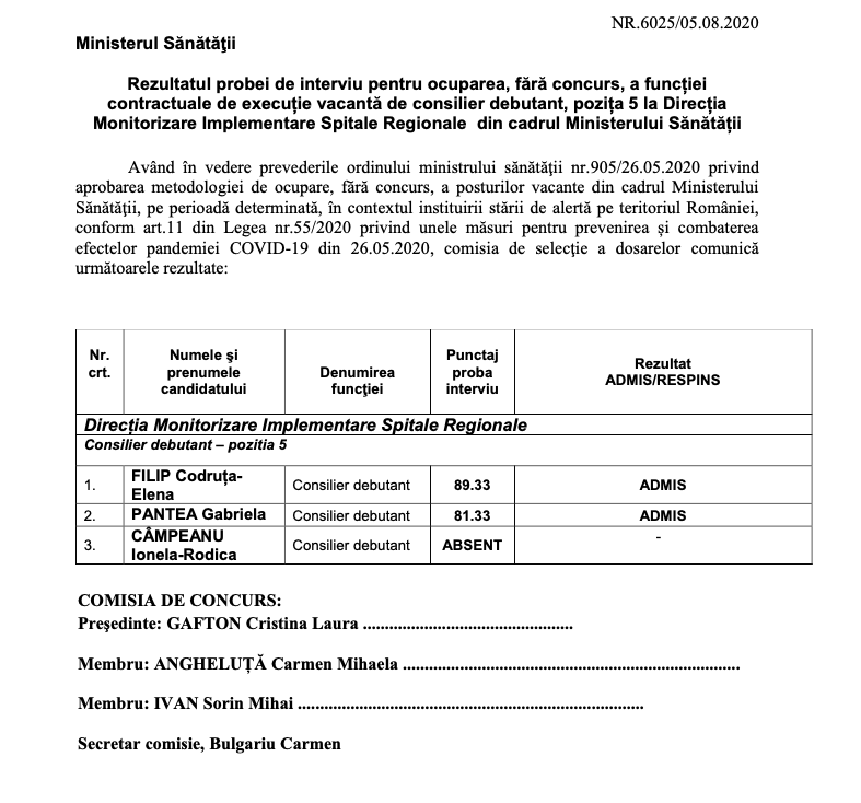 Ocuparea funcției de consilier debutant fără concurs a avut la bază Ordinul de Ministru nr.905/26.05.2020, semnat de ministrul Nelu Tătaru, prin care s-a aprobat „metodologia de ocupare, fără concurs, a posturilor vacante din cadrul Ministerului Sănătăţii, pe perioadă determinată, în contextul instituirii stării de alertă pe teritoriul României, conform art.11 din Legea nr.55/2020 privind unele măsuri pentru prevenirea și combaterea efectelor pandemiei COVID-19 din 26.05.2020”.
