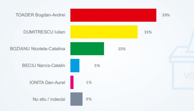 Astfel, conform rezultatelor sondajului de opinie, 39% dintre prahoveni il sustin pe Bogdan Toader, in timp ce 31% si-au manifestat intentia de vot in favoarea lui Iulian Dumitrescu.