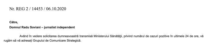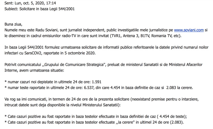Solicitarea mea, de luni, 5 octombrie 2020, ora 17.14, subliniez, către Ministerul Sănătății, organismul care răspunde de sănătatea publică a fost următoarea: