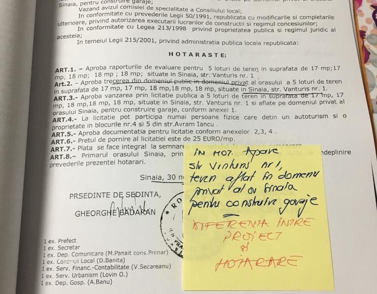 Astfel, gașca din subordinea structurii edilitare Sinăiene, la comanda mult alesului primar si a prietenilor acestuia, in coautorat, complicitate si, adesea, in autorat cu unii consilieri locali si chiar cu sprijinul conferit si chiar cu participarea sefului Politiei Locale Sinaia, Popa Gheorghe, au pus la cale un plan diabolic prin care, după ce, in prealabil au ticluit si au pregătit acțiunii ilegale, au consfințit la emiterea, pe cai oculte si clandestine a unor acte, decizii si documente false atât in forma cat si in conținut, si pe care le-au introdus in circulațiile oficiale procedurale interne ale instituției Primăriei Orașului Sinaia, pentru crearea unor așa-zise stări de legalitate aparenta care sa le asigure posibilitatea de ași atrage in acest mod ilegal acoperit interese care exced limitelor de legalitate si prin care sa fie, aceștia, puși in deplina proprietate.