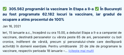 Și de aici, mergem la o altă ,,sursă oficială” – Comitetul Național de Vaccinare. Care, ne informează că până ieri, 16 ianuarie (în jurul orei 14.00 când au emis comunicatul), s-au făcut în Etapa a II-a 305.562 de programări, cu 75% mai mult decât ne informează astăzi, oficial STS, prin primul ministru, pentru un interval care mai include câteva ore.