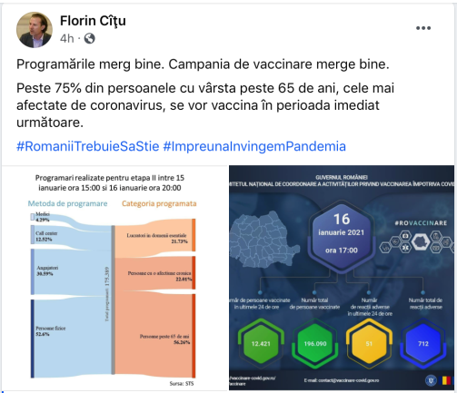 Informația corectă este: 2,7% din persoanele de peste 65 de ani s-au programat pentru vaccinare în Etapa II. Informația minicinoasă, cea fake, este cea furnizată de Florin, pe baza datelor presupus corecte de la STS (care arată diferit față de cele de la Comitetul de Vaccinare) și anume: ,,Peste 75% din persoanele cu vârstă peste 65 de ani, cele mai afectate de coronavirus, se vor vaccina în perioada următoare”. Insa diferenta dintre numarul de programari comunicat de STS și cel comunicat de Comitetul de Vaccinare este strigatoare la cer: 175.389 față de 305.562, pentru acelasi interval, dezvaluie analistul Radu Teodor Soviani.