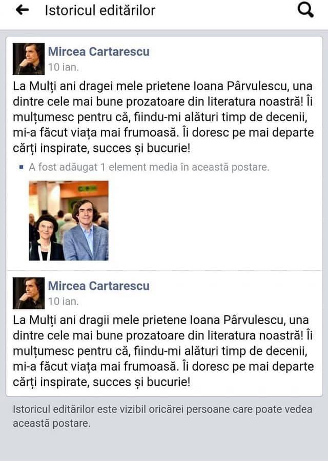 Eu v-am mai spus ca nivelul de caterinca din tara asta e scapat de sub control! Nu am niciun dubiu ca ati vazut polemica dintre doamna Steer si domnul Cartarescu! Doamna il acuza pe domnul ca a scris gresit, domnul o acuza pe doamna ca nu stie forma de dativ , povestea se incheie cu doamna care-i cere scuze domnului ca intr-adevar domnul are dretate! Problema e ca daca te duci la postarea domnului si dai view edit history, ceea ce va indemn sa faceti ca sa vedeti ca asa stau lucrurile, vezi vedea ca si domnul, initial, a scris precum credea doamna ca e corect! “Dragei” si nu “dragii”! Minunat ce va arat aici? Bine! Continuati!:))), dezvaluie jurnalistul Ionut Cristcahe. (Cerasela N.).