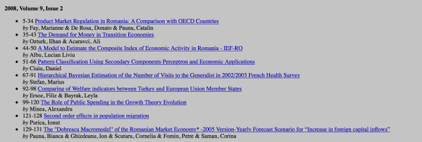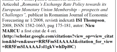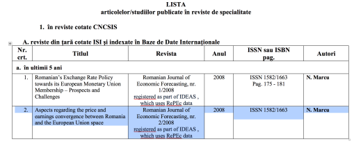 • Revisa cotată ISI Thompson – ,,Romanian Journal of Economic Forecasting”’ nu include în sumarul numărului 2/2008 un astfel de articol, pretins publicat în această ediție. Prin urmare, articolul folosit de Nicu Marcu pentru a dovedi cercetare științifică post-doctorală (și a își lua gradele sau funcții la Universitatea din Craiova), nu există.